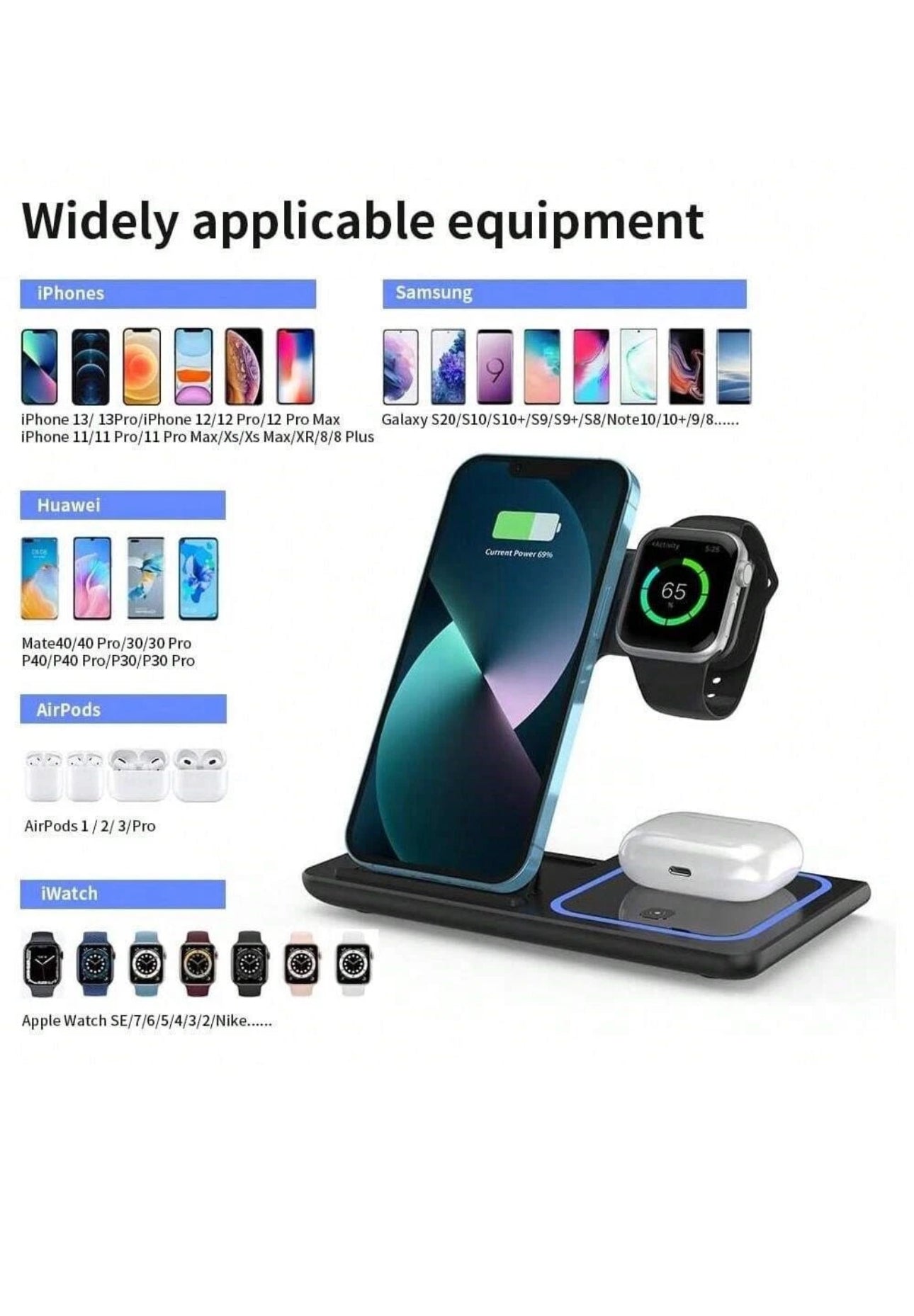 3 in 1 Wireless Charger Station 】 : Is the ultimate 3-in-1 charging solution for all Apple devices and other models. Simultaneously charge your For iPhone, For Apple Watch and For AirPods(Note: mobile phone case try not to exceed the thickness of more than 2mm). 【 Wide Range Of Compatibility 】 : Wireless charger phone charging position is no magnetic suction function, but supports wireless-enabled charging devices, it applies For iPhone 16/15/14/13/13/12/11/13/12Mini/Pro/Pro Max/XS/XR/XS MAX/X/8/Plus/Android Samsung series (note that only wireless charging devices are supported);Watches and headphones are only supported For iPhone models for iWatch 10/9/8/7/6/5/4/3/2/SE/Ultra/Ultra 2 and Air Pods 2/3/4/Pro/Pro 2 (note: AirPods are only compatible with wireless charging cases). 【 Portable Folding Design 】 : For Apple charging station with foldable and lightweight design, can charge up to 3 devices at the same time, non-slip surface ensures that your device stays in place during charging, ideal for home, office, travelling, it provides fast and reliable power supply, easy to put in your bag, i Phone wireless charger say goodbye to clutter and hello to efficiency. A thoughtful gift for your loved ones/friends On/Off Indicator light: The charging station provides adjustable ambient lighting. At night, touch the switch to control the light, and there will be no light disturbance when sleeping. 【 Multiple Protection of Wireless Charger 】 : The wireless charger overheat protection and foreign object detection. The back of the charging station is also equipped with cooling holes, which can quickly dissipate heat and effectively improve the charging efficiencywhich can protect your device from overcharging damage and ensure charging safety. 【 Travel Portable 】 :It is made of ABS fireproof material, the temperature will stay below 104 degrees Fahrenheit when charging;Smoothly folds 180°, high-end compact appearance is easy to carry, suitable for home, office, travelling and any occasions. Notice: 1. The watch charger only for Apple watch, NOT FOR Samsung watch or others watch.